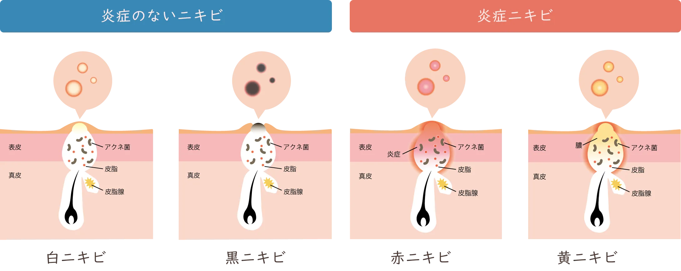 ニキビは「思春期だけの悩み」ではなく、大人になってからも長く付き合う肌トラブルです。 ニキビの種類と原因を正しく理解することが、適切なニキビ治療への第一歩となります。